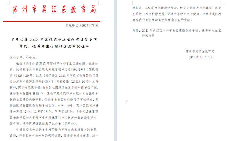 祝贺我校方言小课堂社团在2023年吴江区中小学社团建设先进学校、优秀学生社团评选活动中荣获二等奖,感谢尤芳芳老师的辅导!!