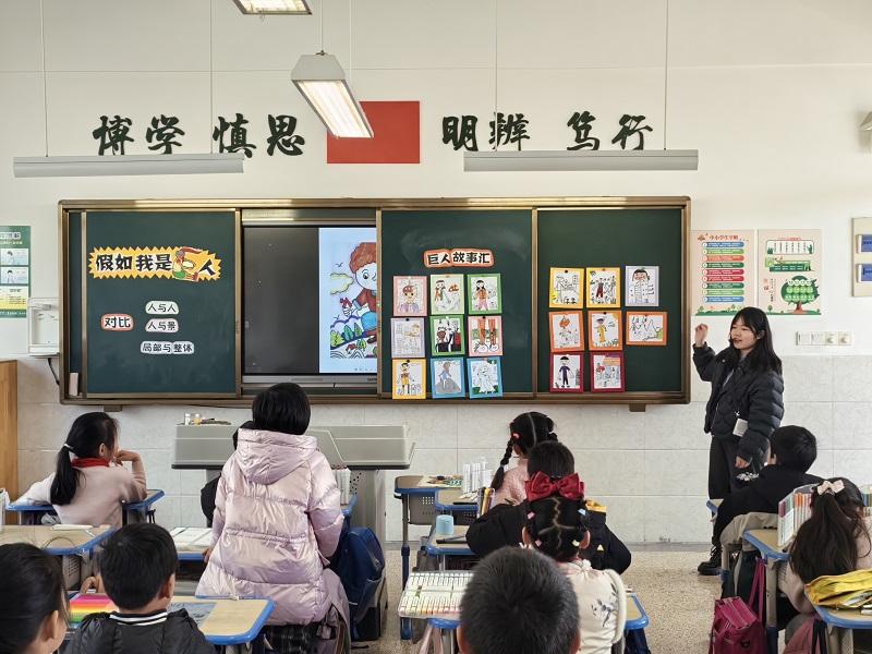 杨少军老师的以《格列佛游记》这一故事开头,学生的注意力被吸引过来,同时提出问题“你觉得故事中的巨人是怎样的?”进而引导出本课的主题《假如我是巨人》。整节杨老师采用循序渐进的教学方式,让孩子在欣赏美的同时学会自己构思自己的作品。