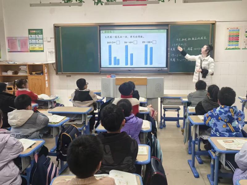 首先,一年级年级数学组范萍老师进行了《十几加几和相应的减法》的课例展示,本节课范老师构建深度课堂落细核心素养之“数感”培育;用动手摆一摆小方块的数学小游戏引导孩子复习旧知,通过小组两位同学合作摆方块和交流计算方法等多种自主学习方式突破难点,放手让孩子们大胆交流,讨论加法和减法在计算时有什么相同的地方,在生生互动中增强孩子们计算熟练度和准确度。